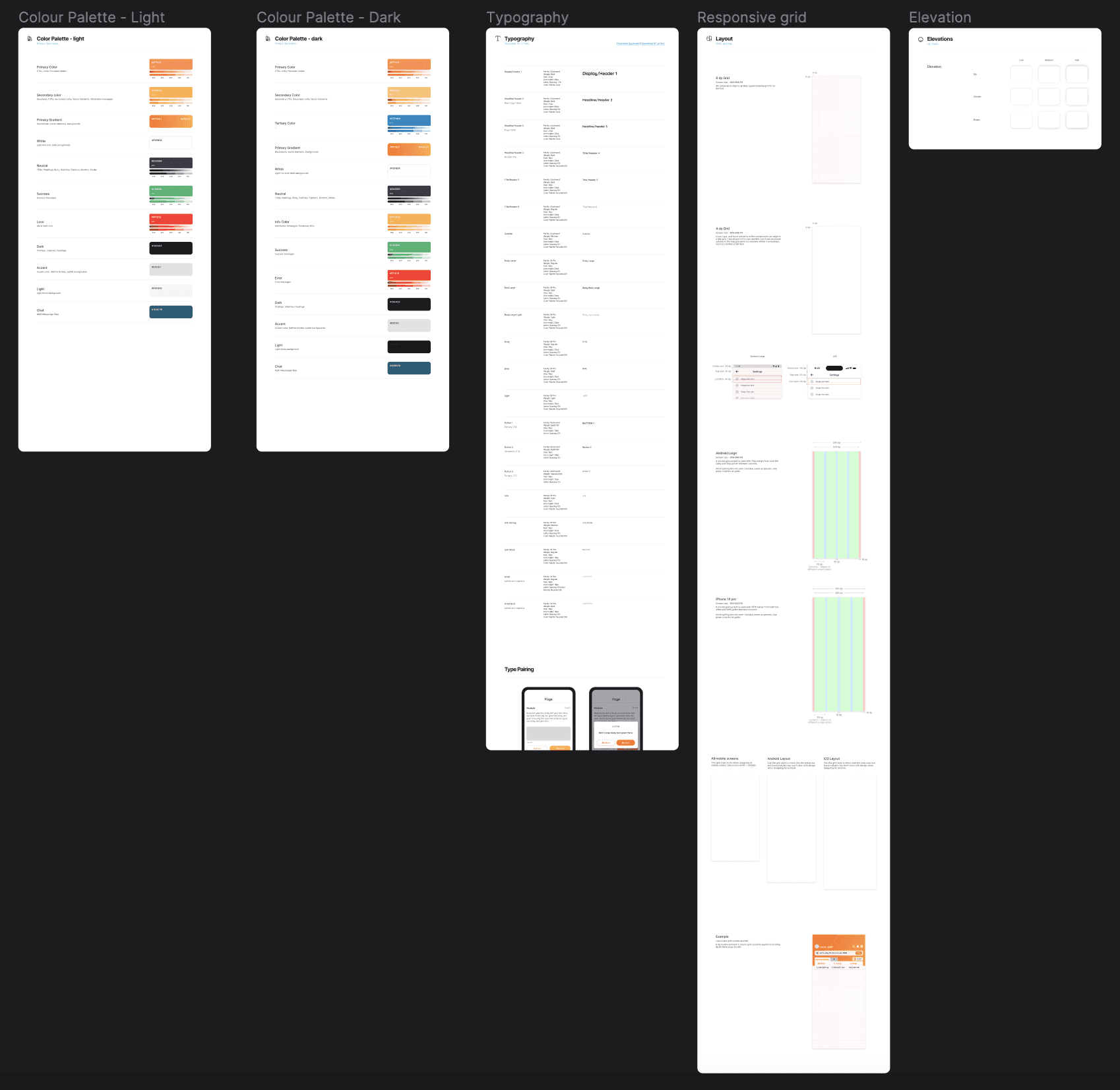 In the styles page, I defined guides for typography, color styles, elevations, and spacing and layout grids.