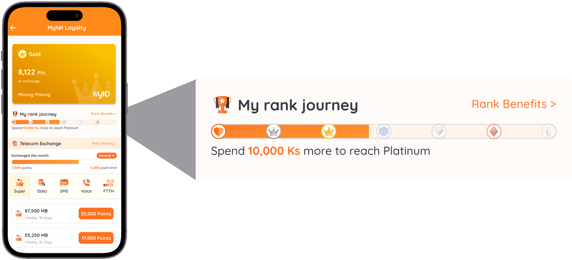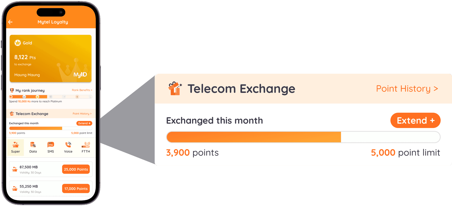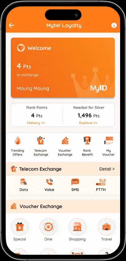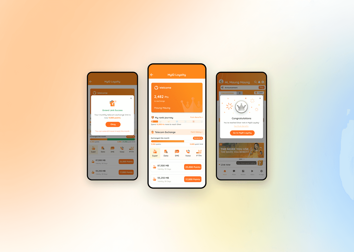 MyID Loyalty Program is for on-net users to earn points based on main balance usage. Points can be exchanged for telco deals. The higher the rank, the bigger a user’s annual birthday gift is and the higher their monthly point exchange limit is.